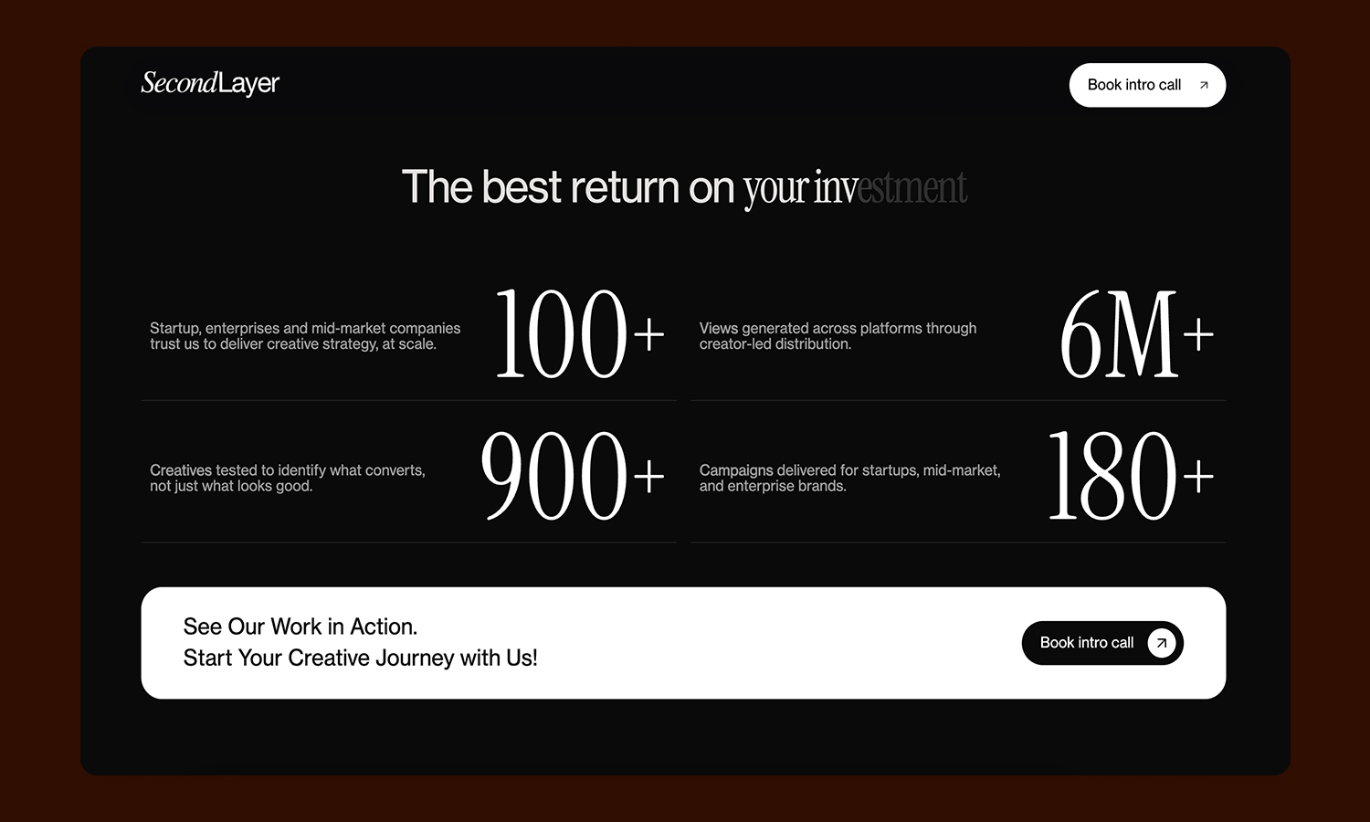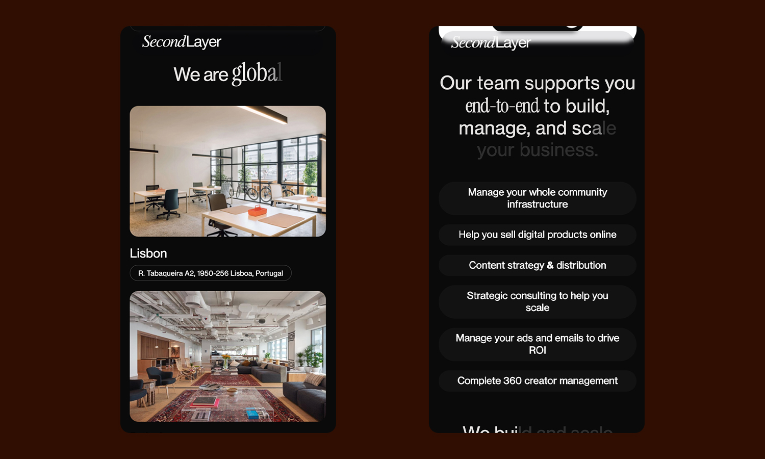 Second Layer approached us with the need for a strong digital presence that matched the quality and seriousness of their services. As a global brand based in Dubai, working with creators worldwide, the objective was to position them as a premium, trustworthy partner capable of scaling creator-led digital channels.
